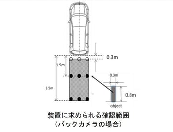 必要とされるカメラは、車体の後方30cmから3.5メートルまでの範囲が確認できるもの、センサーは、20cmから1メートルまでの範囲を感知できるものとされています。