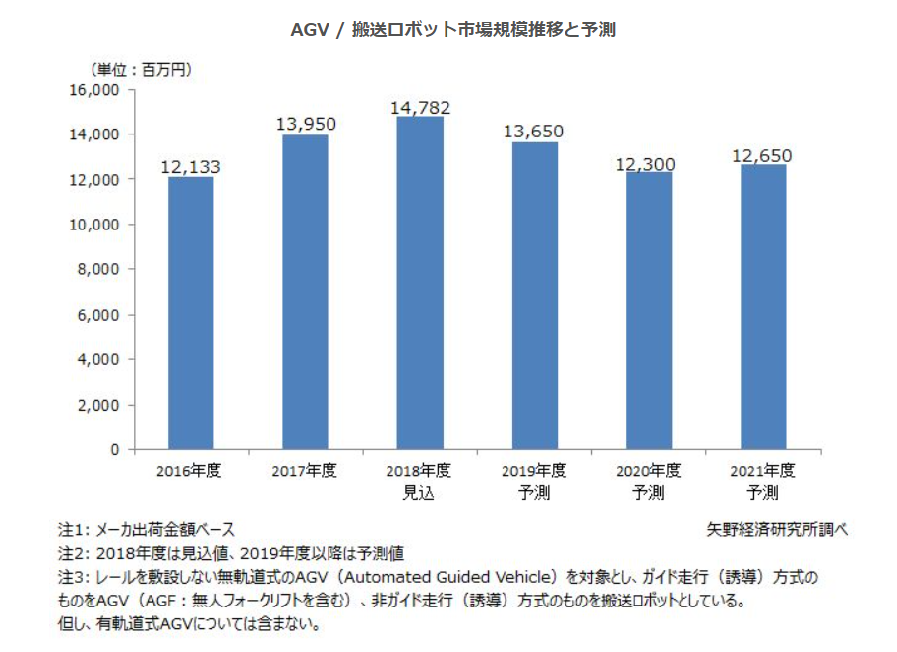 株式会社矢野経済研究所が2018年度に行った、AGV市場の市場規模推移、参入企業動向、将来展望などの調査によると、既存設備の更新需要が落ち着くことで2019年度以降のAGV/搬送ロボット市場は一時減速としています。