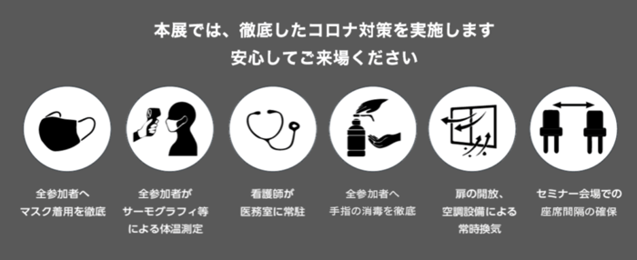 また、展示会場は開催にあたり上記の感染症拡大予防策を実施予定ですので、安心してご来場ください。
