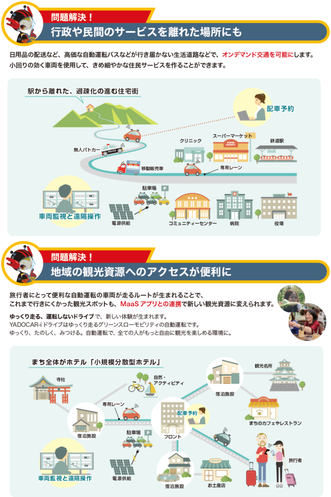 TCLは、自治体及び観光関連業界に対し、低価格自動運転の活用モデルとして「後のせ自動運転システムYADOCAR-iドライブ」を提案、自動運転走行のデモンストレーションを実施し、システムの有用性、利便性を可視化します。