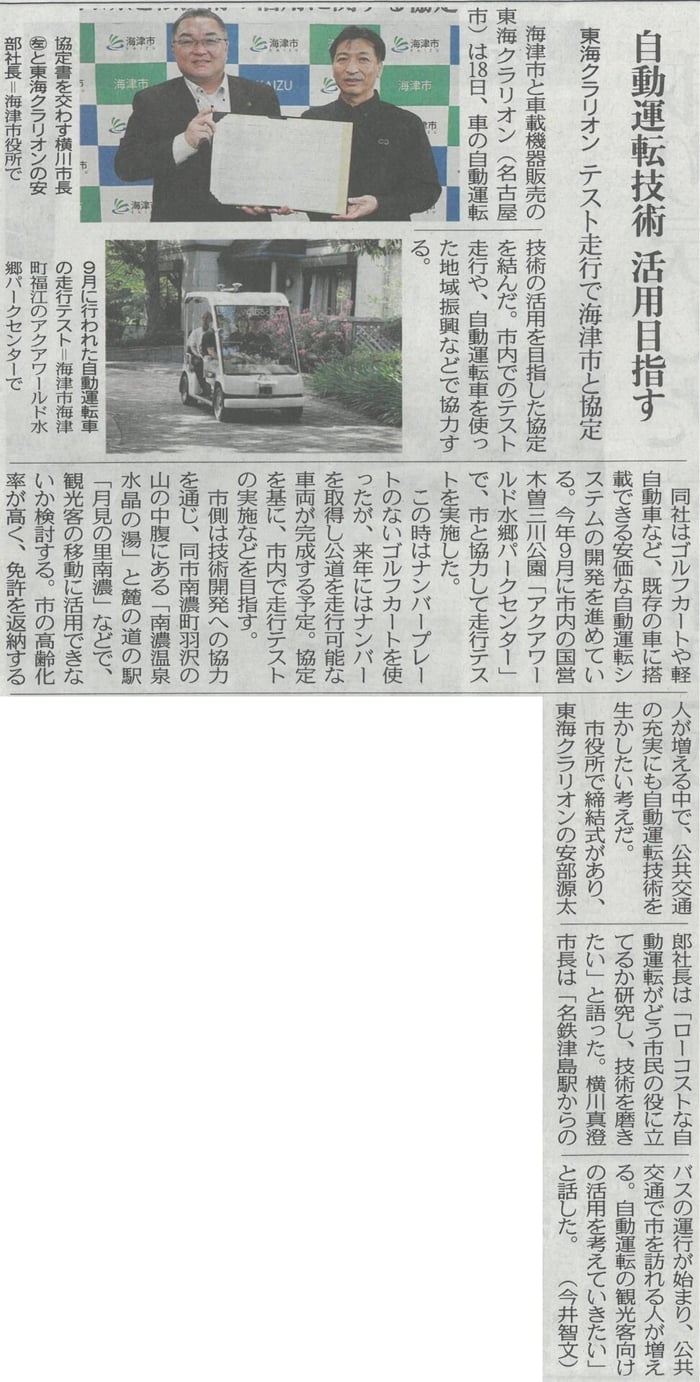 岐阜県海津市と東海クラリオンは、10月18日(水)に自動運転技術の活用に関する協定を締結いたしました。