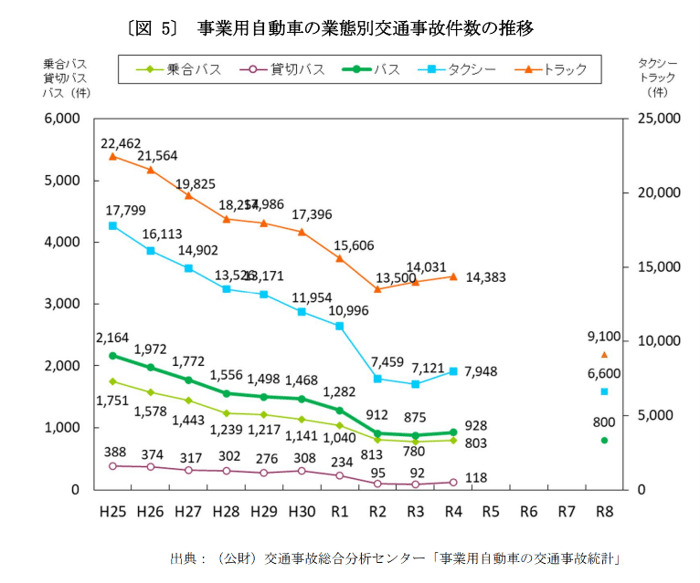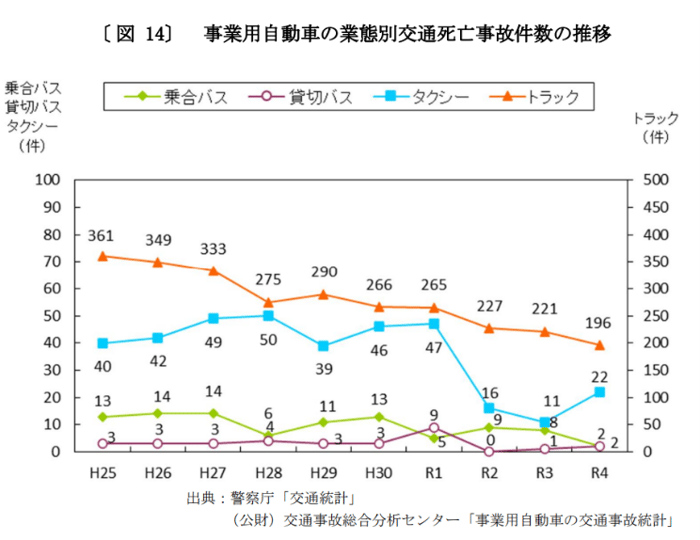 交通事故統計(令和 4 年版)(https://www.mlit.go.jp/jidosha/anzen/03analysis/resourse/data/r05-1.pdf)」によると、令和4年は事業用自動車の交通事故件数が前年と比べて全ての業態で増加しており、その中でもトラックの交通事故数が最も多いです。また、事業用自動車の業態別交通死亡事故件数の推移を見ると、トラックが大半を占めていることも発表されており、トラックによる事故を早急に防ぐべきであるということが分かります。