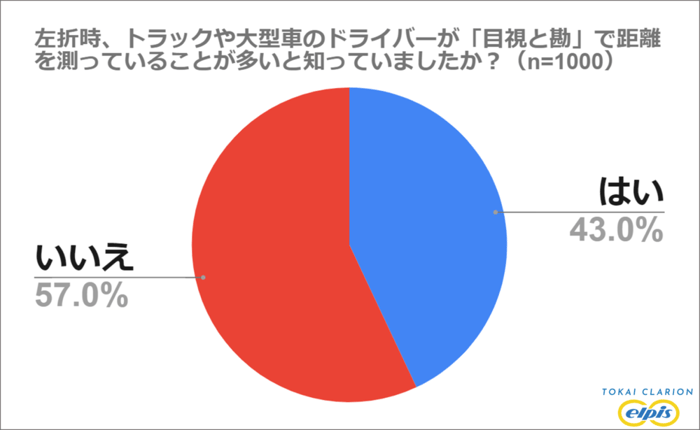 対象者への 「左折時、トラックや大型車のドライバーが“目視と勘”で距離を測っていることが多いと知っていましたか?」という質問に対し、57 パーセント(570 名)の人が「いいえ」と答えています。