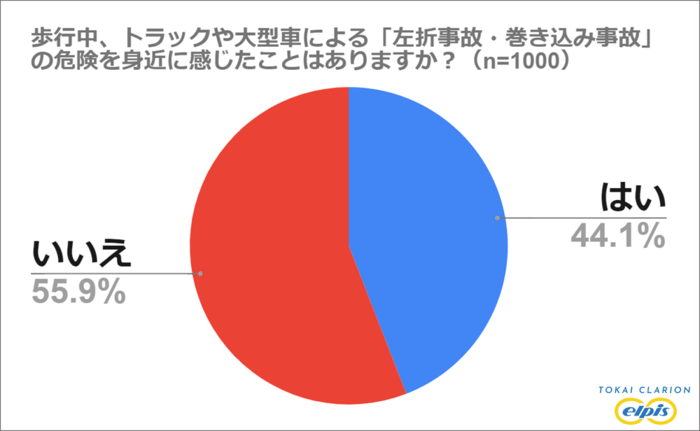 対象者への 「歩行中、トラックや大型車による“左折事故・巻き込み事故”の危険を身近に感じたことはありますか?」という質問に対し、44.1 パーセント(441 名)の人が「はい」と答えました。