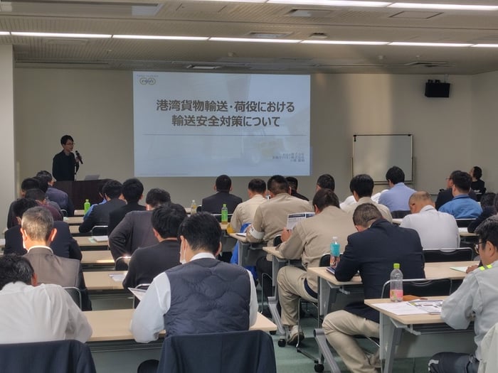 港湾貨物運送事業労働災害防止協会主催の安全衛生セミナーにて、講師として登壇させていただきました。当社は「港湾貨物輸送・荷役における輸送安全対策について」をテーマに講演を行いました。
