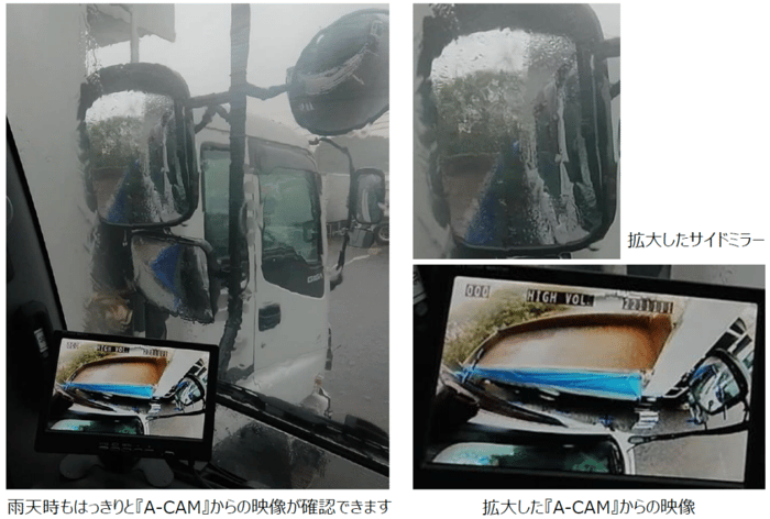 6月から7月にかけての梅雨期は、降雨により視界が悪化し、路面も滑りやすくなることから、交通事故のリスクが高まる季節です。いつも以上に慎重な運転が求められますが、雨粒でサイドミラーがぼやけたり不鮮明になったりすると、安全確認自体が難しくなることも少なくありません。このような場面で活躍するのが、当社製品の巻き込み警報カメラシステム『A-CAM』です。『A-CAM』は、カメラレンズが真下ではなく、ななめ下を向いていることで水滴が付着しづらく“雨でも見える“を実現しています。